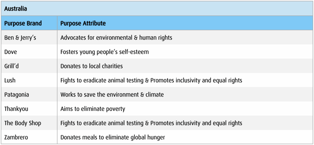 The first step was to select brands that were ‘exemplars’ of the brand purpose strategy. That is, brands that have been consistently executing their brand purpose for a significant amount of time. These purpose brands were selected based on secondary research (e.g. via their advertising, packaging, websites, and advertising awards), and then confirmed with other independent researchers. The selected purpose brands are displayed below.