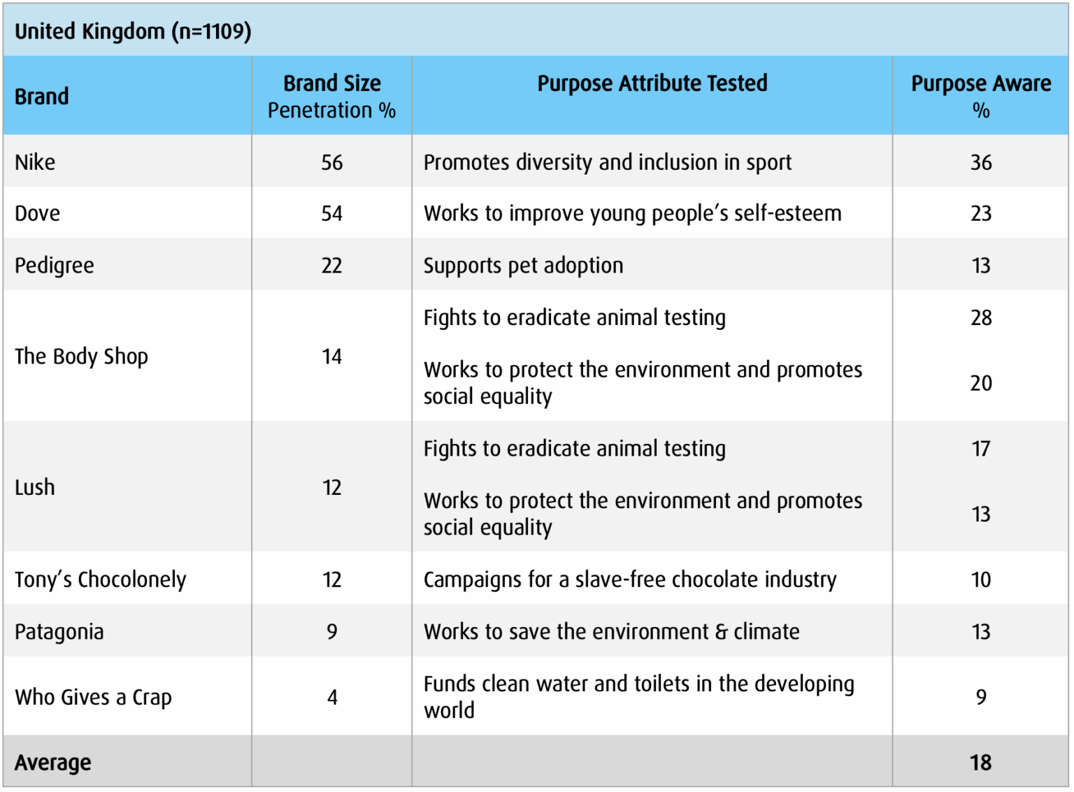 Table 5: Brand Purpose Awareness Results for the Target Brands (sorted by brand size)