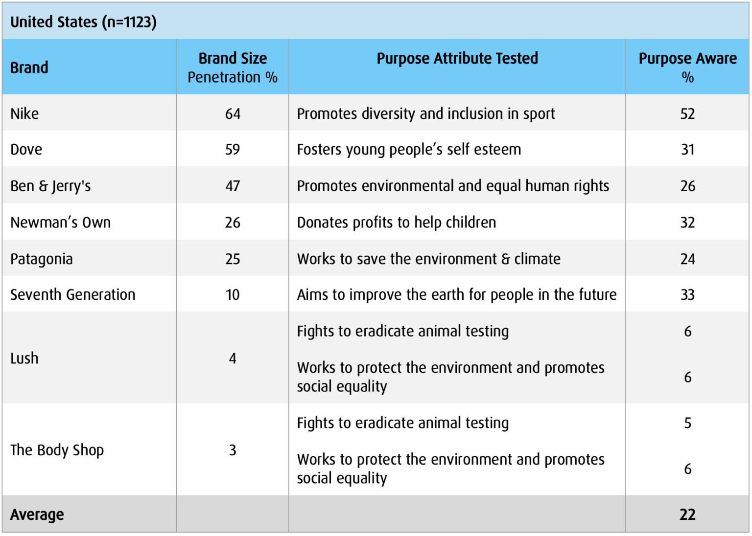 Table 1 shows the purpose recognition results for each brand, sorted by brand size. On average, a purpose brand in Australia scored 14% (consumers who recognised the brand’s purpose), 18% in the UK and 22% in the US. Almost all brands scored under 30%, with Nike being an outlier, scoring 32% in the UK and 52% in the US. These scores need to be interpreted in the context that all these brands have been promoting their purpose for a long time.