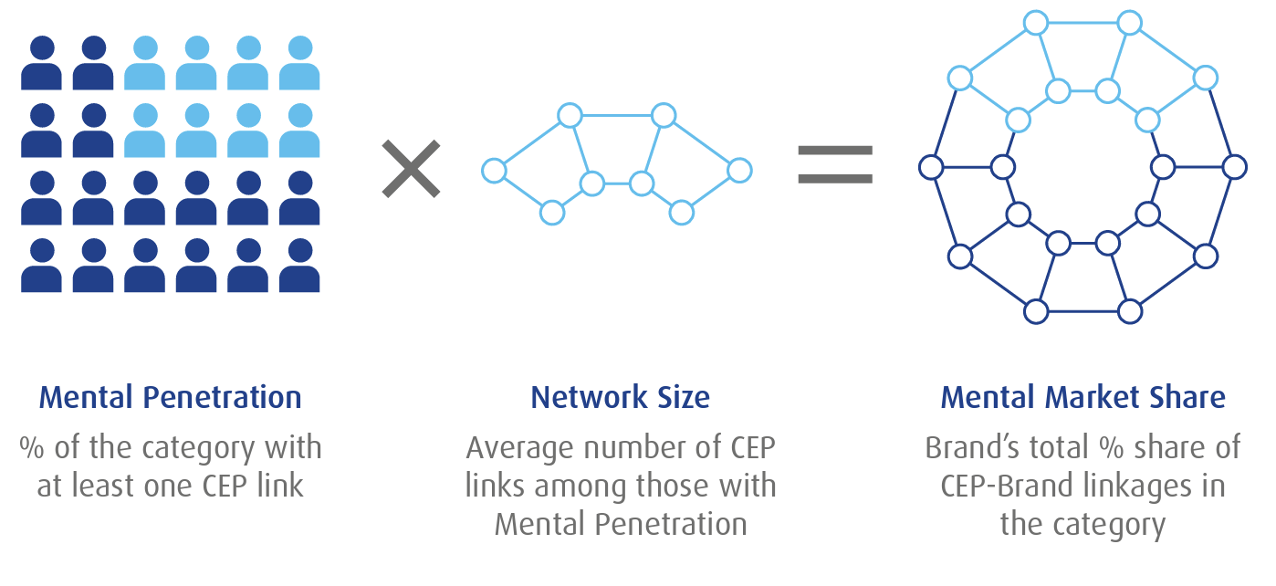 Mental Penetration – This measures if the brand is present in memory, such that it has any chance of being retrieved = (n category buyers with linkages for a brand) / (total sample size)