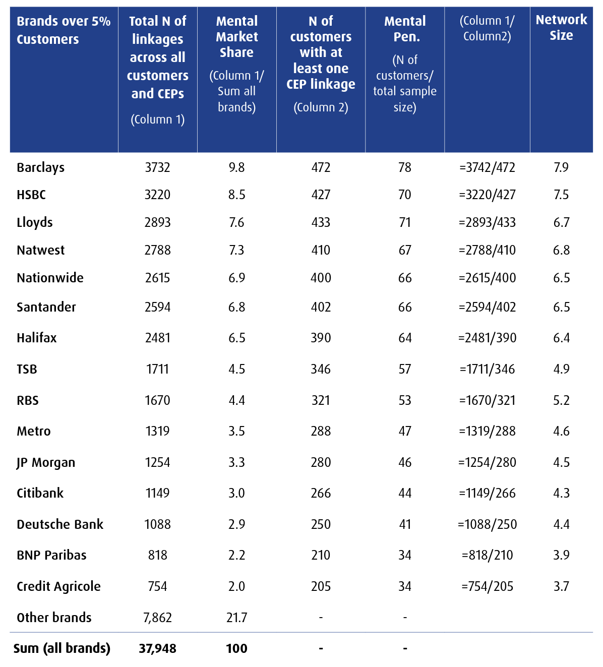 Mental Market Share – This is the brand’s share of CEP-Brand linkages in the category = (n linkages for a brand) / (total linkages for all brands across all CEPs)For example Barclays gets 3,732 linkages out of a total of 37,948, which equals 9.8%. In contrast RBS has 1,670 linkages out of 37,948, which equals 4.4%.