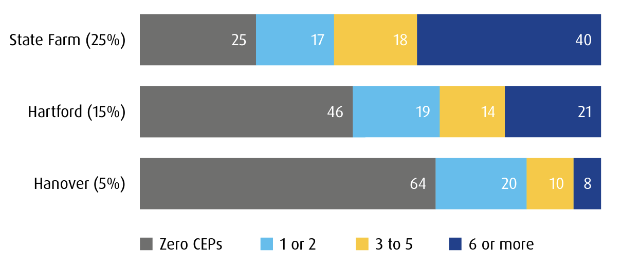 The outcome of wider, fresher network of CEPs is highlighted by comparisons of bigger and smaller brands in the same category. Bigger brands/companies have more people who have linked more CEPs to the brand than smaller brands – this is what we mean by wider, fresher networks. For example, in Figure 1 from the US Business Insurance category, State Farm, with 25% penetration, has more decision-makers with six or more CEPs and fewer with zero CEPs than smaller brands Hartford and Hanover. If you want to grow, you need to grow the CEP network too.