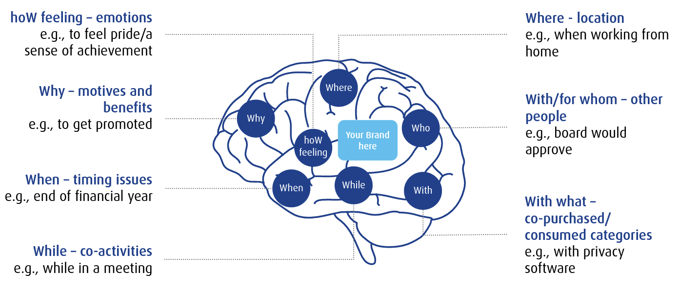 How do we find a category’s CEPs? This is about discovering the retrieval cues category buyers use to evoke brands – or rather what would fit at the end of this question: ‘Looking for a brand that…<insert CEP>’ The W’s framework can give some structure to CEPs generation, and can ensure we get diversity across buyers and time.
