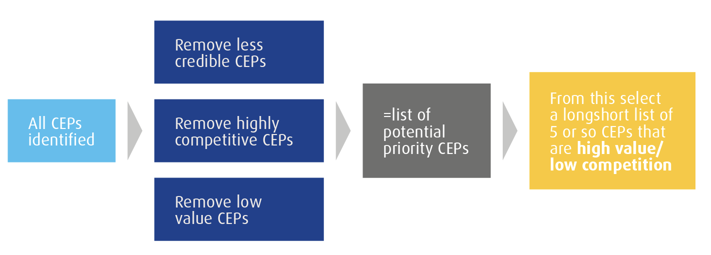 Choosing the CEPs to invest in is a process of elimination: eliminate the CEPs that are poor choices for
