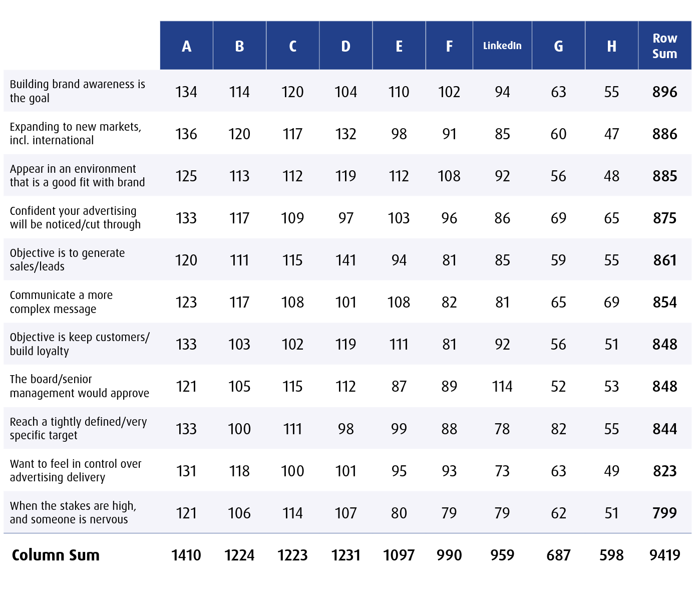 Table 1-3 is a truncated, blinded example from n=311 online advertising decision-makers in the United States, run on behalf of LinkedIn Marketing Solutions. The example is a truncated table of nine brands and 11 CEPs, with the number of responses for each platform on each CEP (see Table 1). You will see that the columns and rows are organised by column and row totals. This is to reveal the two underlying patterns in the data.