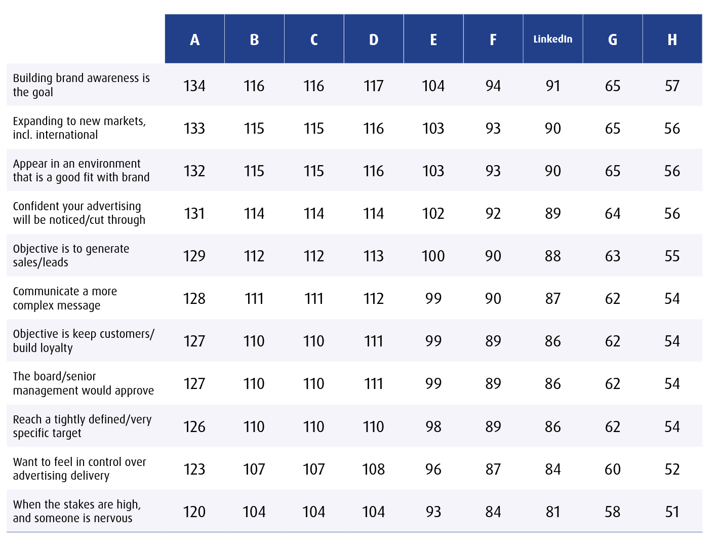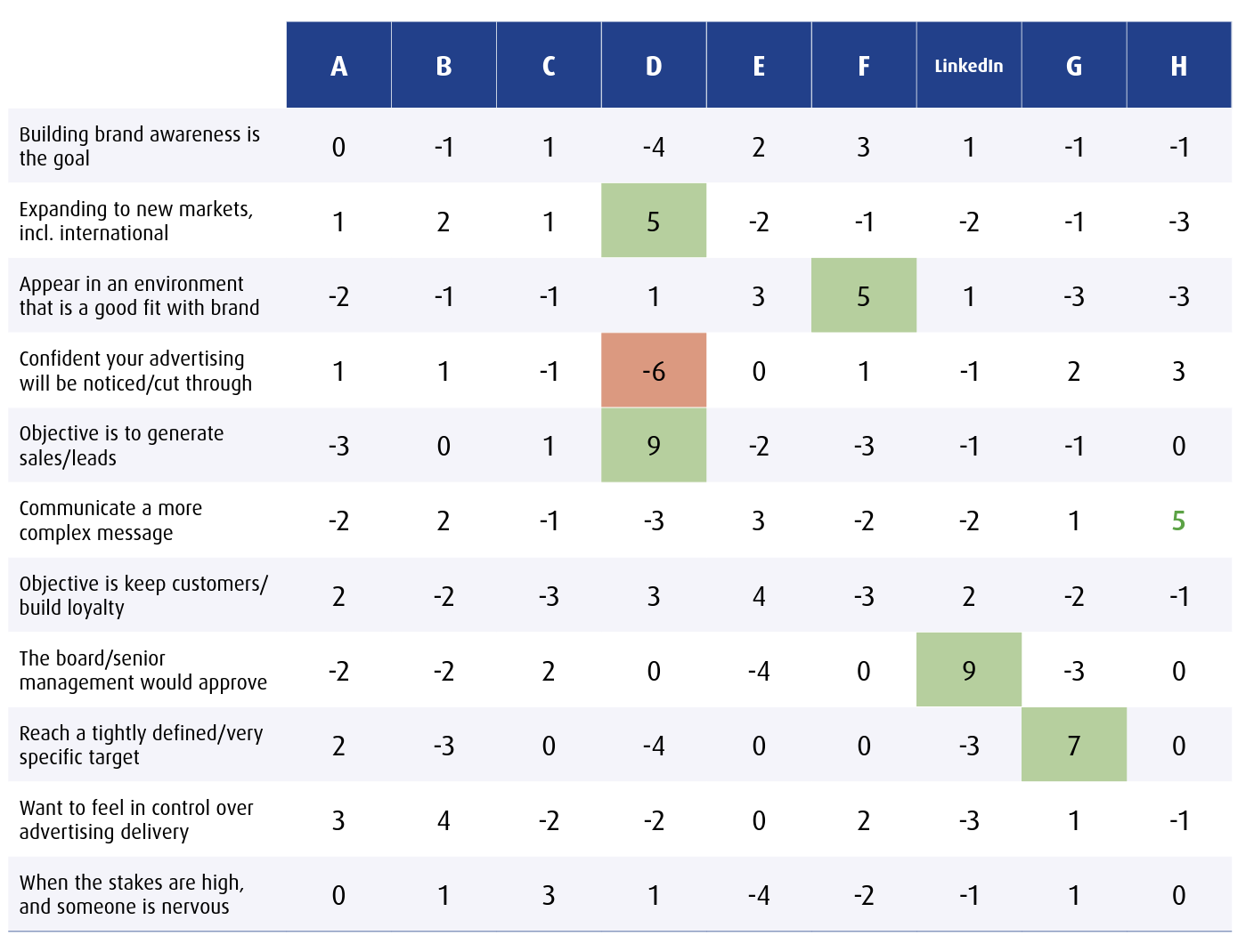 Table 3 shows the deviations from expected values for the whole table. Most brands score very close to expected on all CEPs. Out of the 99 possible brand-CEP deviations, 93% score as expected (within the +/-5pp band). Of the deviations of note, six are mental advantages including Linkedin on The board/senior management would approve (+9pp) and Company G for Reach a tightly defined/very specific target (+7pp). There is only one is a mental disadvantage, and scores lower than -6 (Company D on Confident your advertising will be noticed/cut through).