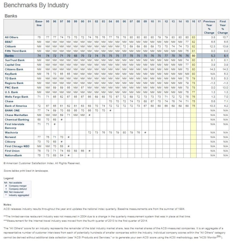 Table 1 shows evaluation of service performance scores across major US banks over a twenty-one-year period. Apart from a small dip around 1999 for all banks, performance seems to be around 70 to 80 out of 100. Much of that variability is likely to be accounted for by random sampling variation which creates the illusion of dramatic changes, changes that marketers would need to explain.