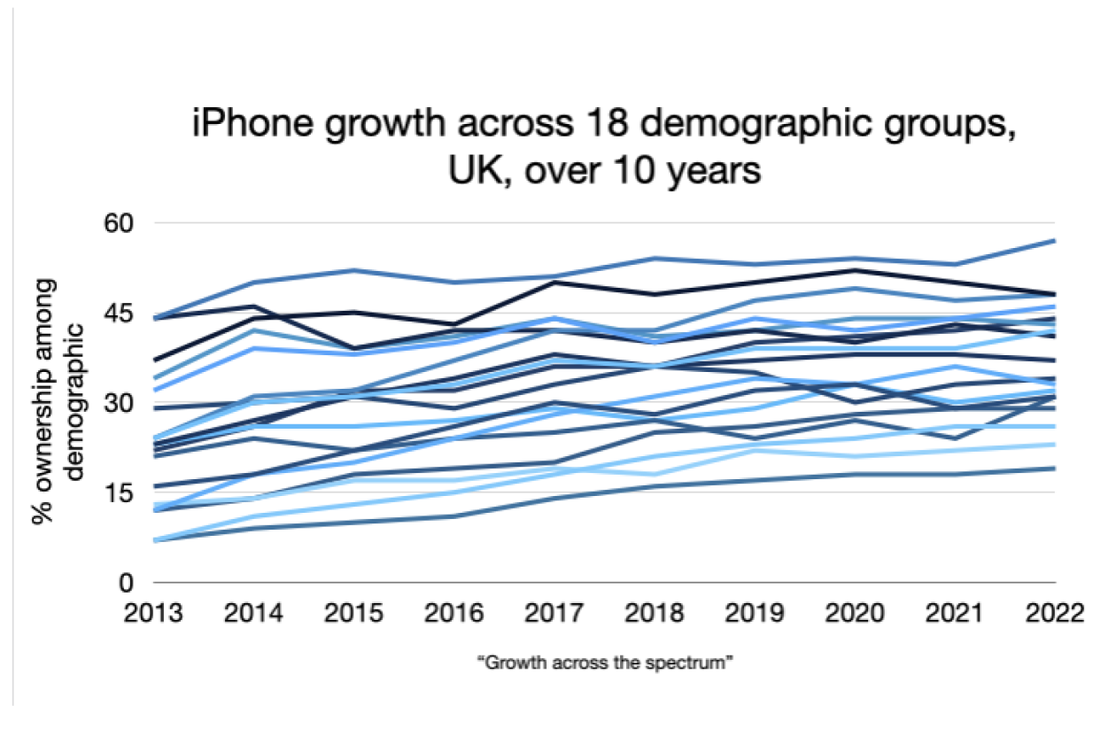 Our growth example is the iPhone – a brand that grew strongly in the UK over a decade. Using YouGov data, we split out its growth over time across different demographic groups. We created groups based on age (young, medium, older), gender (female, male) and income (low, medium, high) to make 18 distinct population groups ranging from young, female, low income to old, male, high incomeand every combination in between. We then extracted the proportion of each group that said they owned an iPhone, over the years 2013 to 2022. The results are shown in the graph below. Overall, we see that the iPhone increased its ownership among almost every group, in fact to 17 of the 18. On one group, namely young, male, high income, ownership declined for the iPhone by a couple of points from 2013 to 2015 then stayed stable.
