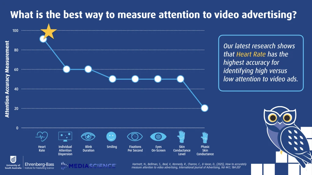 Attention has been proposed as a replacement for ratings to better measure advertising exposure quality. Attention measurement suppliers, who are key stakeholders in this proposed shift, have primarily used eye tracking to assess how people pay attention to ads. However, other literature-supported physiological measures may be beneficial or superior for measuring attention to advertising (e.g. heart rate, skin conductance). This research used a lab-based experiment that manipulated attention levels to video ads (i.e. high vs low) to test the accuracy of a range of potentially scalable physiological attention measures. Eight physiological measures were collected and compared to electroencephalogram (EEG),a ‘gold standard’ but non-scalable direct measure of attention, and a survey-based self-reported attention measure. The results suggest that eye tracking measures have problems discriminating high attention from low attention. Heart rate proved best at this discrimination task and has the advantage of being able to measure attention to sound as well as visuals.