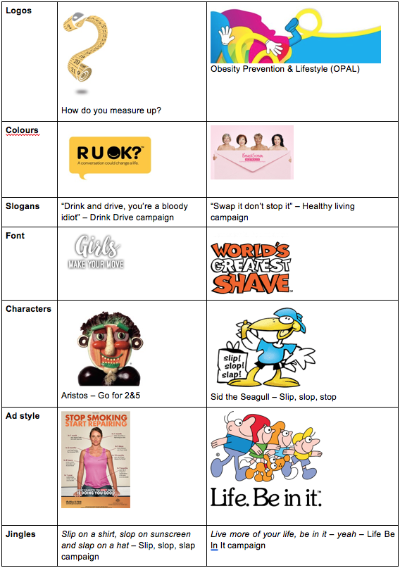 Examples of distinctive assets that have been used in public health campaigns in Australia include: